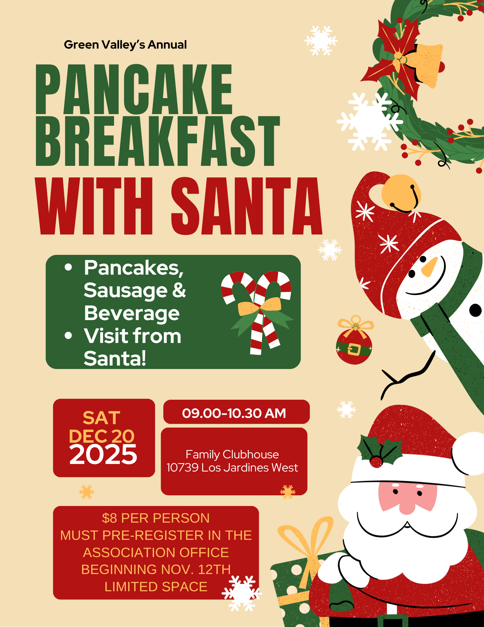 Highlights & Upcoming Events: Join our Facebook Page - GREEN VALLEY REC (Rei. only) POOL UPDATES: Green Valley Pools are for residents and their guests only. They are not available to the general public for open swim. BOARD NOMINATIONS DUE - Fri., Nov. 21st HOLIDAY DECORATING CONTEST - Fri., Dec. 19th PANCAKE BREAKFAST WITH SANTA - Flyer COMMUNITY SHRED DAY - Sat., Jan. 24, 2026 TOWN HALL MEETING - Tues., Jan. 27 Flyer BOARD ELECTIONS - February 3 WINTER STROKE CLINIC - February 17 to March 27 Flyer BARBECUE, BEVERAGES & BINGO - March 20 EASTER EGG-CITEMENT - April 4 PLAY GROUP - Weds, 9:30 to 11:30am, Community Room, begins September 10 Flyer Aqua Tone Classes are offered at the North Pool on Tues, Thurs & Sat at 10:00 a.m. PiYo Live & SOULFusion classes are offered in the Family Clubhouse, Tues 4-5pm & Thurs 5-6pm Book Library is open during office hours. Green Valley Swim Team - www.gvdolphins.org See Gazettes in Newsletter link for additional information!