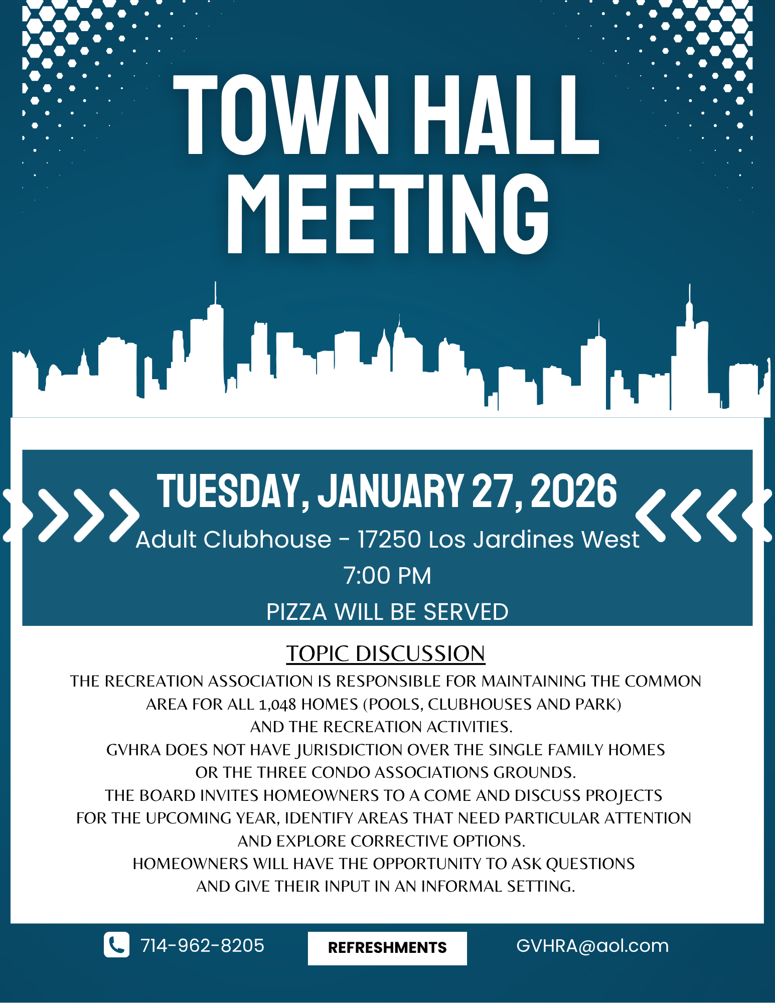 Next monthly Board meeting is 1/27/26 @ 6:30pm in the Adult Clubhouse 17250 Los Jardines West. (Agenda is available the Friday before the meeting.)